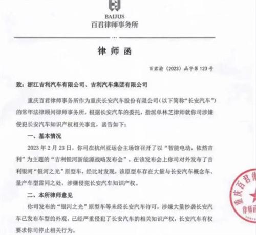 近日一封來自于長(zhǎng)安集團(tuán)的律師函包括一封吉利的回應(yīng)聲明將長(zhǎng)安和吉利兩個(gè)汽車品牌又一次推上了熱搜。在2023年2月27日長(zhǎng)安汽車品牌委托重慶百君律師事務(wù)所,向吉利汽車有限公司,吉利汽車集團(tuán)有限公司發(fā)放了一封律師函,在該律師函中長(zhǎng)安汽車明確指出,北京時(shí)間2023年2月23日吉利銀河新能源戰(zhàn)略發(fā)布會(huì)上所發(fā)布的新款汽車吉利銀河系列“銀河之光”,該款車型和長(zhǎng)安汽車概念車輛鏟車內(nèi)有著非常多相似的地方,長(zhǎng)安集團(tuán)在律師函中明確指出,吉利集團(tuán)涉嫌侵犯長(zhǎng)安汽車知識(shí)產(chǎn)權(quán),要求吉利集團(tuán)立即停止相關(guān)的侵權(quán)行為。