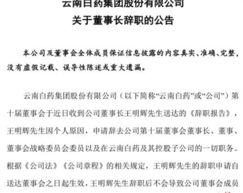 根據王明輝發出的辭職報告中顯示,因個人原因辭去云南白藥集團有限公司第10屆董事會董事、長董事、董事會戰略委員會委員及云南白藥和控股子公司的一切職務。這份辭職報告也將會在送達公司董事會當天開始起效,云南白藥集團在公告中表示,王敏慧辭職之后,并不會使云南白藥董事會成員低于法定人數。