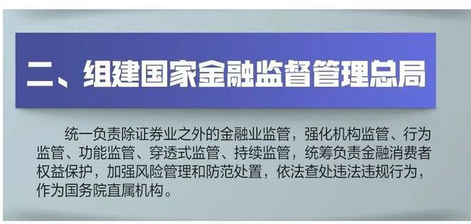 我國將會重新組建國家金融監督管理總局對于除了證券之外的所有金融業進行統一管理,強化機構的監管力度對于行為監管,功能監管和穿透式監管,來對金融消費者的權益進行全面的保護,同時還要加強風險管理的防范,對于一些違法措施依法給予嚴厲的出發,不是組建的國家金融監督管理總局應該作為國務院的直屬機構來進行管理。
