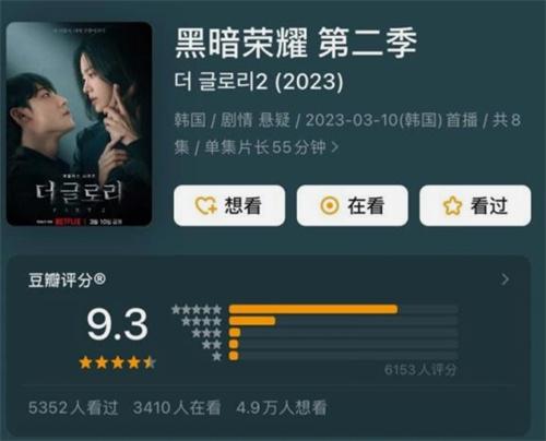 近日《黑暗榮耀2》在平臺奈飛播出之后,成為各大平臺的熱搜榜首,幾乎將近一半的話題都在圍繞著《黑暗榮耀2》,主要隨著劇集不斷的播出,迎來不錯的口碑,之前黑暗榮耀第1季已經在豆瓣評分達到8.9分,大概29萬人都已經對黑暗榮耀進行打分,沒想到第2季的黑暗榮耀居然有16.4萬人得出9.3的高分。這一切幕后的推手正是平臺奈飛,據了解奈飛是在2021年之后股價成為下跌趨勢,新用戶的增加也非常的緩慢,隨著《黑暗榮耀2》的播出對外流媒體巨頭奈飛產生巨大的作用,據數據的報道,現在第2季播出之后,奈飛平臺的韓國用戶數量急劇增加,創下新的記錄,有希望回到原先的增長。