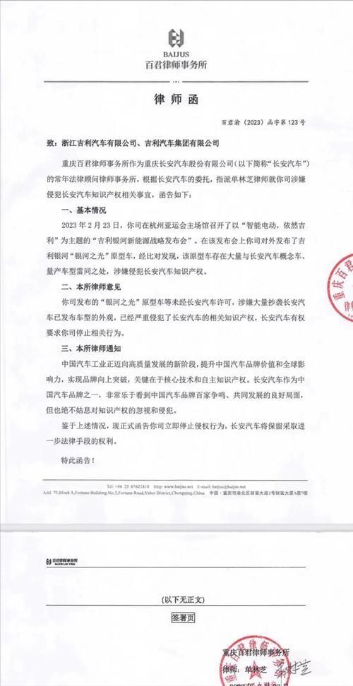 此次抄襲事件,長(zhǎng)安汽車方面認(rèn)為吉利銀河的銀河之光原型車與長(zhǎng)安汽車的概念車和量產(chǎn)車型在很多地方都有雷同。目前長(zhǎng)安汽車已經(jīng)委托了重慶百君律師事務(wù)所向吉利汽車發(fā)送律師函。