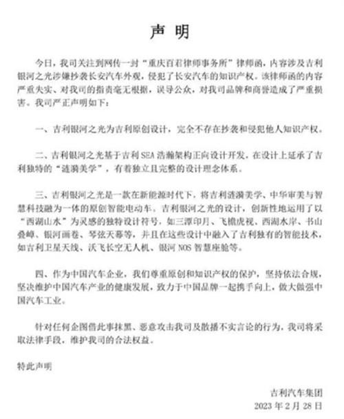 吉利汽車面對(duì)此次抄襲的傳聞發(fā)布了相關(guān)的聲明,指出律師函上的內(nèi)容嚴(yán)重與事實(shí)不符,認(rèn)為律師函上的信息對(duì)公眾產(chǎn)生了嚴(yán)重的誤導(dǎo),也對(duì)吉利汽車的商譽(yù)以及品牌形象產(chǎn)生了很大的損害和影響。在2月28日時(shí)發(fā)布了聲明,稱吉利銀河之光的車型屬于吉利的原創(chuàng),并不存在抄襲以及侵犯知識(shí)產(chǎn)權(quán)的情況。