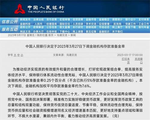 中央銀行于3月17日發布消息,將會從2023年的3月27日開始降低金融機構的存款準備金率,下調0.25%,金融機構的加權,再經過本次降準之后,所獲得的平均存款準備金率會達到7.6%。預計將會向銀行體系所釋放的長期資金達到了5000~5,300億元人民幣。每年會為銀行節約的成本將會達到56~60億元人民幣。