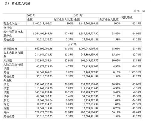 因為ChatGPT的概念一度走紅,在一個月內曾經得到兩次關注函的漢王科技也公布了2022年財報,去年凈虧損額度為1.36億,文本大數據的服務總營收占比為15.3%,去年營收額度為2.15億元,同比有22.71%的下降。