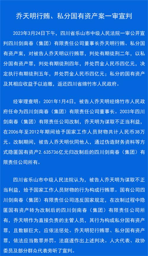 樂山中院的微信公眾號發布消息,樂山中級人民法院一審判處四川劍南春有限公司董事長喬天明有期徒刑5年,并處罰金人民幣4億元。