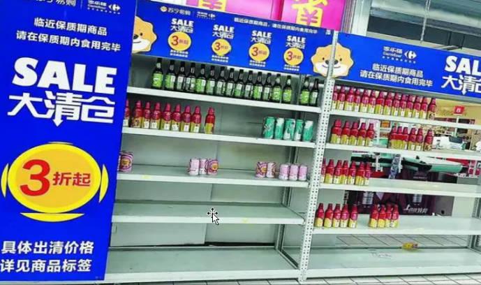 近期家樂福的調整收縮仍在持續中,有記者走訪了北京多家家樂福超市,很多都貼了停業的公告,創益佳店是家樂福在中國內地的首家門店,也是中國內地第一家超級大賣場,現在店內的很多貨架都空置,沒有售完的商品也用膠帶進行打包,門口貼著停業的公告,準備撤店,在收銀臺的附近擺放了很多大清倉的貨架,上面有一些酒水,飲料正在低價處理。
