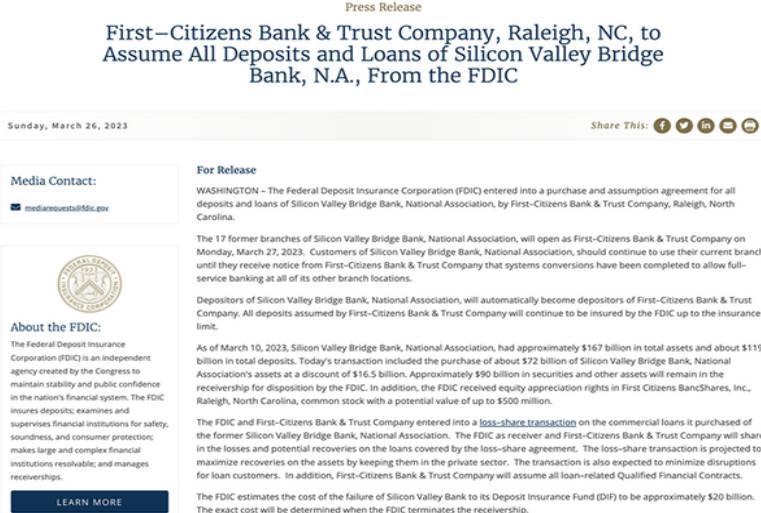 公民銀行已經簽訂了收購和受讓的相關協議,硅谷銀行所有的儲戶都會成為第一公民銀行的儲戶。這是為存款的業務提供保險,根據美聯儲的數據顯示。在2022年底第一公民銀行作為美國排名第三十的資產商業銀行,希望這一舉動可以將民眾對銀行系統的信心再次加強。