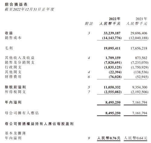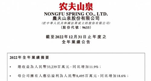 因?yàn)橐咔橐约霸蛢r(jià)格所產(chǎn)生的波動(dòng),影響農(nóng)山泉在去年的營收凈利,整個(gè)增長的速度呈現(xiàn)放緩的局面,成本的上漲使得毛利率出現(xiàn)了回落。農(nóng)夫山泉股份有限公司在3月28日的晚間,將2022年的業(yè)績報(bào)表作出公布,年度總收入為332.39億元,相較上年同期有11.9%的增加,歸屬于母公司。在凈利潤上大約達(dá)到84.95億元,同比增長為18.6%,美股在基本盈利上是0.76元,建議在期末股息中派發(fā)每一股0.68元。