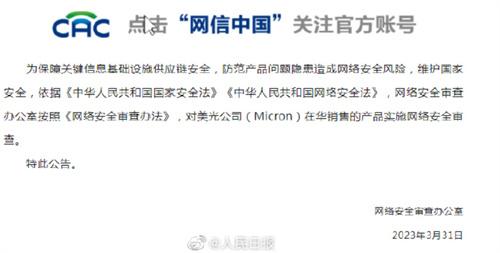 在3月31日,國家網絡安全審查辦公室發布了一條公告,公告中宣稱為了保障關鍵信息基礎設施供應鏈安全,防范產品問題隱患所造成的各種網絡安全風險,依據國家安全法和國家網絡安全法,依法對美光公司在華所銷售的各種產品實施網絡安全審查,這一則消息爆料之后,美光科技的股價一時之間連續崩盤,下跌了約3%左右。