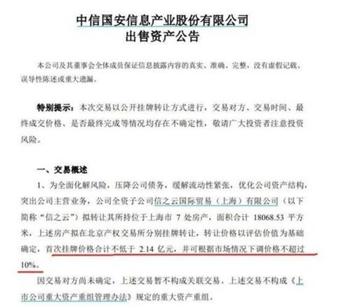 在ST國安所發布的公告當中,可知是為了減輕公司所存在的債務,全面化解公司的風險,緩解流動資金的緊張,讓公司資產結構方面更為優化,信之云作為全資子公司將上海擁有的自住房產對外轉讓,在北京產權交易所分別進行掛牌,具體的轉讓價格以評估后的價值作為基礎,最終確定,在市場情況下,其調價的價格不能夠超過10%,總計是不低于2.14億元的。