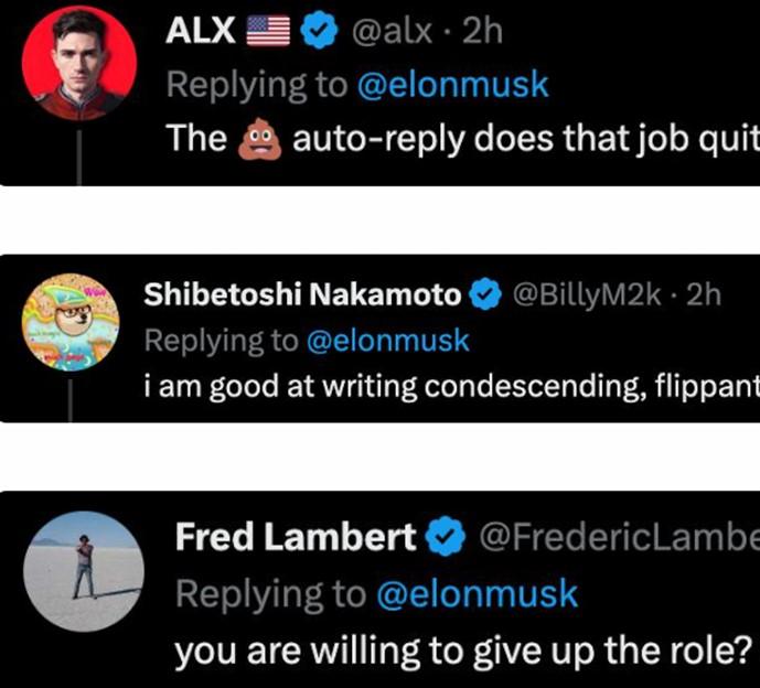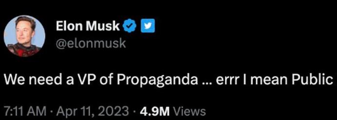 4月9日,據(jù)外媒報道,馬斯克在個人社交媒體上發(fā)布了一條推文,該推文中講到在線誠招PR副總裁職位,針對此事,很多網(wǎng)友紛紛在該推文下留言,質(zhì)問馬斯克是否是愿意讓位了?為何此次馬斯克的這條推文會在國外社交媒體上引起關(guān)注,原因竟然是這幾天推特這款社交軟件出現(xiàn)了bug,發(fā)送在好友圈的推特會被一些陌生人看到,所以馬斯克發(fā)布在個人社交朋友圈的這條信息便被公眾收到。