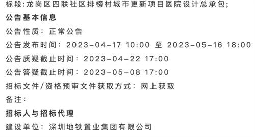 4月17日,深圳公共資源交易公共服務平臺發(fā)布了龍崗區(qū)四聯(lián)社區(qū)排榜村城市更新項目醫(yī)院設計的招標公告,這份公告中顯示,招標方為深圳地鐵置業(yè)集團有限公司,該項目更新范圍用地約為60.66萬平方米,項目計劃總投資約為464.43億元,拆除范圍用地面積約為50.59萬平方米左右,其中包含住宅面積,131點八五萬平方米,安居型商品房面積約為8.7萬平方米,公共租賃住房約為8.7萬平方米,租賃型人才住房面積為8.7萬平方米。