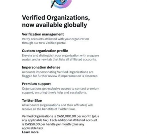 馬斯克在接管Twitter之后清理掉了之前所遺留的認證賬號,4月21號馬斯特正式宣布用戶或者是企業想要在Twitter平臺投放廣告,就必須去訂閱Twitter Blue服務,每個月需要付費8美元折合人民幣是55元,或者是企業每月支付1000每原購買erified Organizations 訂閱服務。