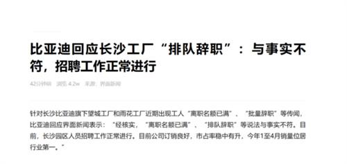 北京時間5月8日,網傳比亞迪長沙工廠出現離職名額已滿,或批量辭職等傳聞,并引發社會各界的廣泛關注,該事件發出以后,比亞迪官方立刻對此回應。