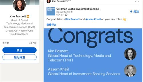 Kim Posnett在高盛集團(tuán)的職業(yè)生涯,最早可以追溯到2005年當(dāng)時(shí)年僅20歲出頭的她就已經(jīng)加入到了高盛集團(tuán),最開始她的職務(wù)是從TMT投資銀行集團(tuán)的助理,憑借著個(gè)人的努力和出色的成績(jī)表現(xiàn)在三年之內(nèi)她就已經(jīng)成為了副總裁,又過了4年以后從副總裁成為了董事總經(jīng)理,到了2016年開始擔(dān)任高盛集團(tuán)的合伙人,在2021年Kim Posnett成為了高盛集團(tuán)歷史上第1名也是全球范圍內(nèi)最年輕的投資銀行主管。