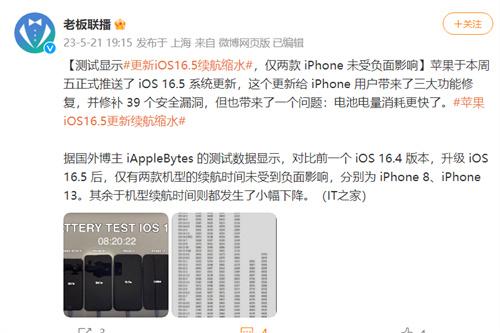 5月21日,蘋果在本周五正式推送了IOS16.5的系統更新,這次更新中為iPhone手機用戶提供了三處功能的修復,并且修補了39個安全漏洞問題,此次更新后,有手機用戶表示自己更新之后的手機電池電量消耗更快了,根據外國博主的測試數據顯示,相較于先前的系統版本,只有兩款手機機型的續航時間沒有收到負面影響,分別是iPhone8和iPhone 13,其余的手機機型續航都出現了小幅度的下降現象。