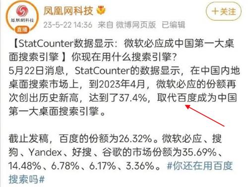 近期,據相關統計機構的數據顯示,中國內地桌面搜索市場中,百度已經不是中國第一大桌面搜索引擎,截止到2023年的四月份,微軟必應搜索引擎所占據的份額創建了歷史新高,達到了百分之37.4的數據,百度的份額僅為百分之26.32,成功取代百度,成為了中國第一大桌面搜索引擎工具。