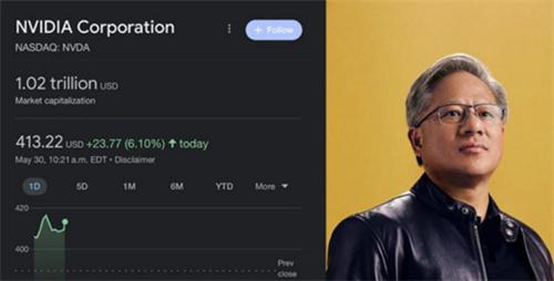 5月30日晚,美股開盤后英偉達股價上漲約4%,總市值成功突破萬億美元的大關,這組數據意味著英偉達已經成為了全球第一家市值突破萬億美元的芯片公司,同樣是全球第一家由華人創立的萬億美元市值公司。目前,在市值方面,僅次于蘋果、微軟、亞馬遜與Alphabet,整體市值大致相當于1.8個臺積電,3.3個貴州茅臺或4.9個阿里集團。