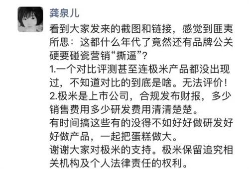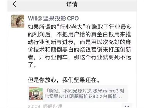 堅果這邊公開指責自家產(chǎn)品以次充好,極米這方面必然是不肯善罷甘休,很快便在朋友圈發(fā)表文章,聲稱如今都已經(jīng)什么年代了,竟然還有品牌公關要靠撕逼來碰瓷營銷,發(fā)布的對比測評甚至連極米公司的產(chǎn)品都沒有出現(xiàn),也不知道這條測評視頻究竟在對比什么東西,這樣的測評視頻簡直是無法評價。