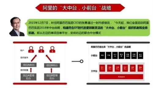 阿里巴巴集團CEO張勇表示,公司中后臺能力將會有序進入到相關的業務集團以及公司內部,將會為前臺業務的發展發揮出重要的作用,多個業務集團和公司將會共享中后臺的服務,并且通過專業的服務公司模式享有該服務。在2015年的時候,阿里巴巴就已經提出了大中臺的戰略體系,并且設立了阿里巴巴中臺事業部,將原先的搜索事業部數據技術及產品部和共享業務事業部總合在一起。