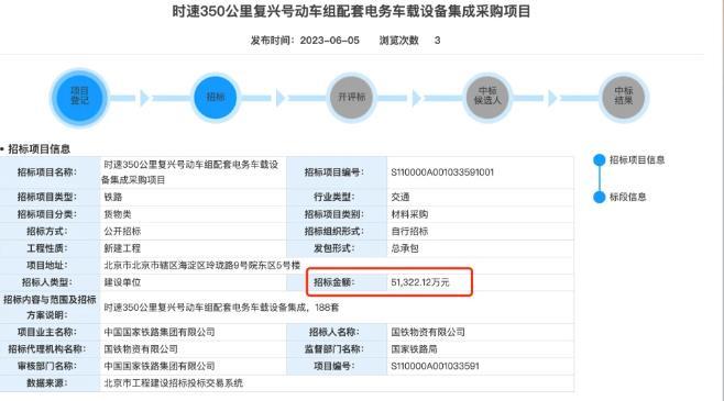 另外,電務(wù)車載設(shè)備集成采購項(xiàng)目包括188套時(shí)速350公里復(fù)興號(hào)動(dòng)車組配套電務(wù)車載設(shè)備集成,招標(biāo)項(xiàng)目金額約為5.13億元。