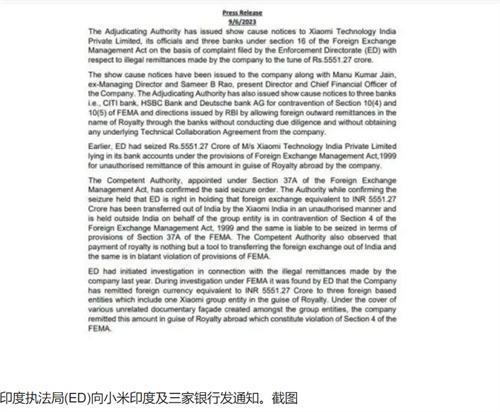 近日,印度執(zhí)法局發(fā)布了正式通告,指控小米公司涉嫌違反印度《外匯管理法》向外國(guó)實(shí)體非法轉(zhuǎn)移資金,目前已經(jīng)向小米技術(shù),印度私人有限公司和小米印度分公司以及三家銀行發(fā)出了正式通知,該通知中顯示,印度當(dāng)局此前扣押小米約合人民幣48億元的資金將會(huì)在此次通告發(fā)布后正式?jīng)]收,這則消息讓很多人認(rèn)識(shí)到印度當(dāng)局的野心,但是人們還是低估了印度政府的下限。