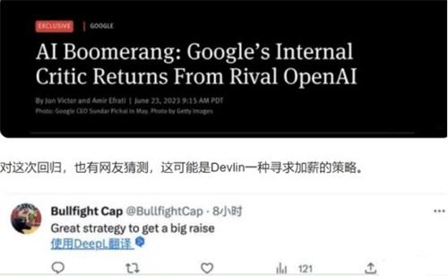 近日,Devlin再次亮出騷操作,剛剛入職OpenAI公司僅三個月,被爆出又回到了谷歌公司。根據知情人透露,Devlin回到谷歌之后會和Bard主要的開發者展開密切合作。此前Devlin離開谷歌公司的原因正式和Bard項目有關,業內人士針對這起事件,直接用了Ai回旋鏢來形容他的這番操作,不過這一次回歸,還有一些網友猜測,或許是Devlin尋求加薪的一種策略。