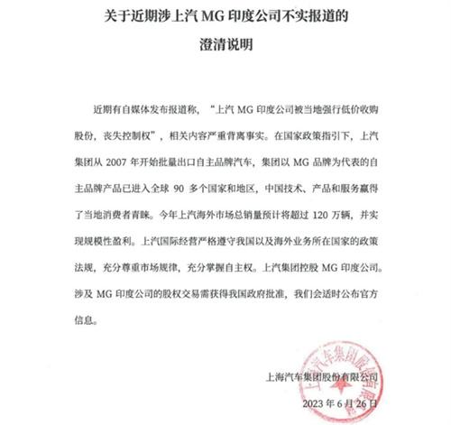 上汽集團(tuán)在公司的公告中強(qiáng)調(diào)稱,上汽國際完全嚴(yán)格遵守我國以及海外業(yè)務(wù)所在國家的相關(guān)政策法規(guī),對當(dāng)?shù)厥袌龅囊?guī)律表示充分尊重,而且在公司自主權(quán)上充分掌握控制權(quán)。上汽集團(tuán)控股mg印度分公司所涉及的股權(quán)交易須得到我國政府的批準(zhǔn),對于這起事件,我們會在適時的情況下公布官方信息。