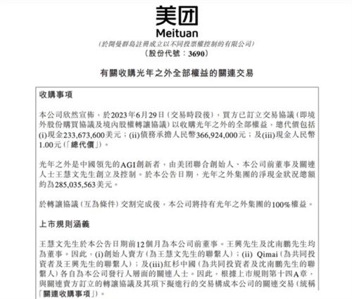 近日,光年之外的創(chuàng)始人王慧文疑似抑郁病住院離崗,給公司帶來了非常嚴重的負面影響,在這個時候,美團官宣將會以20.58億元收購光年之外,收購完成之后美團集團擁有光年之外的100%股權。此次收購的總代價超過了20.58億元,光年之外的賬上約有2.8億美元,美團官方在公告中表示,通過收購獲得領先的agi人才,可以幫助公司更快的發(fā)展人工智能領域,也能在該領域的競爭中獲得更好的發(fā)展趨勢。