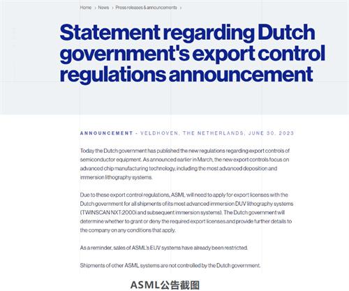 荷蘭光刻機巨頭Asml在6月30日發布公告,在這份公告中稱,荷蘭政府在當天發布有關半導體設備出口管制的最新規定,如三月份宣布的信息那樣,最新的出口管制措施重點是在芯片制造領域,其中是包括了最先進的沉淀和浸沒式光刻機設備,依據這些出口管制的法規來看,公司如果想要把這些設備出口到中國和其他受管制約束的地區,需要向荷蘭政府申請出口許可證。