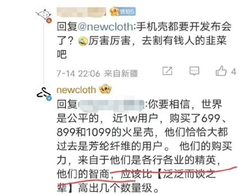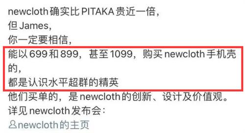 newcloth回懟PITAKA的文章里提到,近一萬用戶購買該公司699元產品的用戶,都是各行各業的精英人士,他們的智商也都是高出了幾個數量級,這樣的說法讓很多吃瓜群眾感到扎心。沒想到買個手機殼還能搞個高低貴賤,難道平民就不配用這些手機殼了嗎,是誰規定699元手機殼的受用群體就是精英人士,很多吃瓜群眾都莫名感到自己被羞辱了。