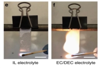 通過熱重分析發(fā)現(xiàn),這種離子液體具有良好的熱穩(wěn)定性,在400℃時(shí),仍無明顯失重跡象。相比之下,一般 有機(jī)電解質(zhì)在132℃以上開始快速減重。所以,這種離子液體電解質(zhì)具有非燃性,不易引起火災(zāi),從而提高電池安全性。