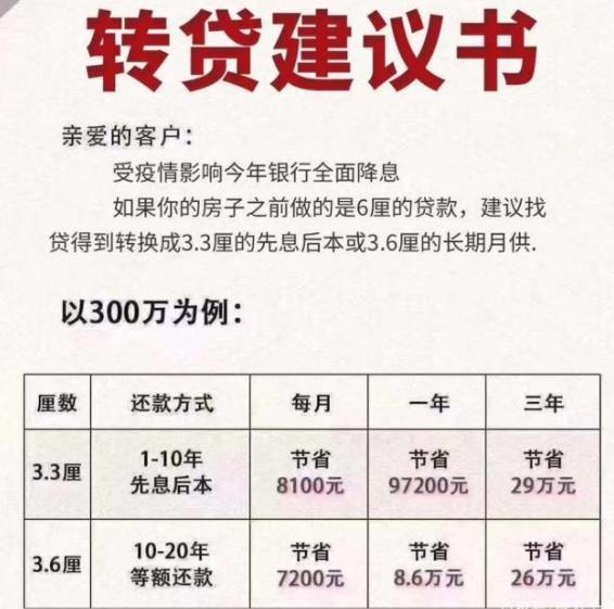 一些貸款平臺稱,如果房貸的金額在100萬元,如果按照等額本息的還款方式貸款20年的利率為6.13%,月供為7239.5億元,利息就達到了73.7萬元,如果通過轉貸的方式將20年的利率調整為4.5%,之后就可以節省貸款利息,21.9萬元,中介稱從獲得貸款的資格主要是讓購房者名下注冊一家公司,然后再找一筆過橋的資金進行房貸的還清,然后再利用房子做抵押,申請經營貸,這樣就可以將過橋資金還清。