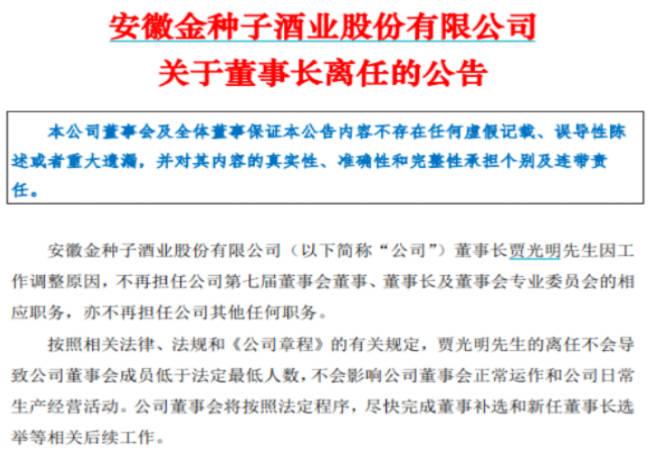 2月22日金種子酒業(yè)剛剛發(fā)布了公告,稱目前公司的董事長賈光明因?yàn)閭€人的工作調(diào)動原因,將會不再擔(dān)任公司第7屆董事會董事,董事長以及董事會專業(yè)委員會的相應(yīng)職務(wù),也不再擔(dān)任金種子酒業(yè)的任何職務(wù),此次金種子酒的董事長突然離任,并沒有說明其他的原因賈光明在上周還剛剛參加了金種子酒的交流活動,根據(jù)金種子酒業(yè)股份有限公司發(fā)布的公告稱,賈光明的離任不會導(dǎo)致公司董事會成員低于法定最低人數(shù),也不會對公司的正常運(yùn)作和生產(chǎn)經(jīng)營活動造成影響,公司目前已經(jīng)按照新的法定程序開始進(jìn)行新董事長的選舉工作。
