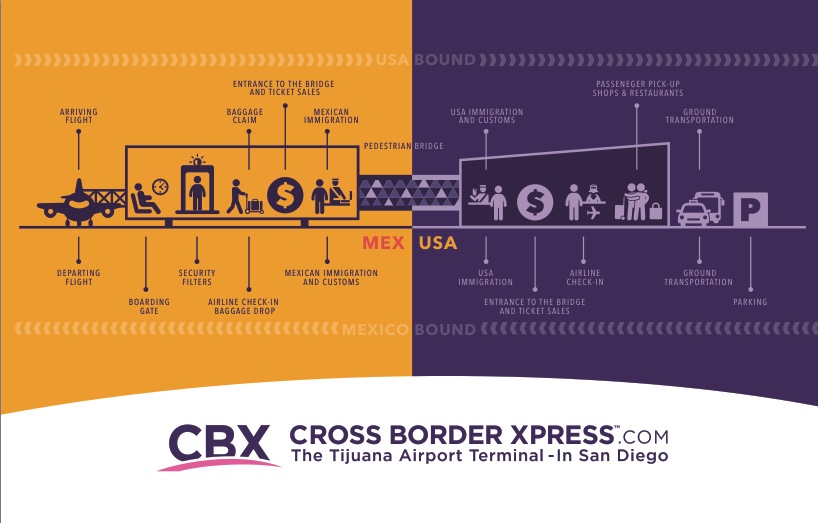 位于加利福尼亞州San Ysidro和Otay Mesa邊境口岸之間55英畝的CBX終端全天24小時開放,還有6家航空公司 - 墨西哥航空公司,Aeromexico Connect,Interject,VivaAerobus(一家沒有裝飾的航空公司)在加利福尼亞南部經營,Volaris和Aero Califia-提供客戶服務。