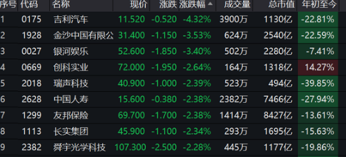 吉利汽車(11.54, -0.50, -4.15%)大跌逾4%,領跌藍籌,金沙中國、銀河娛樂(52.05, -2.40, -4.41%)大跌逾3%,長實跌超2%。