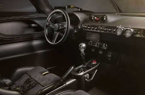 機艙采用大量外露碳纖維,包括 A 柱、門板、方向盤、地板和中控臺。時鐘的表殼采用銑削和車削表面處理,Radford 對儀表板上的開關設備使用了類似的外觀。變速桿有一個帶有拋光件的外露連桿。這輛車的座椅混合了黑色皮革和 Alcantara。