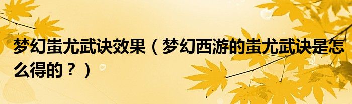 大家好,小安來為大家解答以上問題。夢幻蚩尤武訣效果,夢幻西游的蚩尤武訣是怎么得的?很多人還不知道,現在讓我們一起來看看吧!