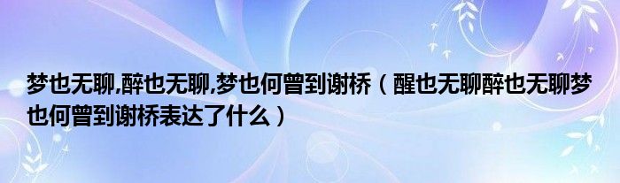 大家好,小安來為大家解答以上問題。夢也無聊,醉也無聊,夢也何曾到謝橋,醒也無聊醉也無聊夢也何曾到謝橋表達了什么很多人還不知道,現在讓我們一起來看看吧!