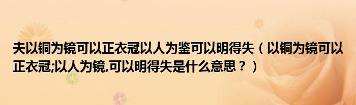 大家好,小安來為大家解答以上問題。夫以銅為鏡可以正衣冠以人為鑒可以明得失,以銅為鏡可以正衣冠;以人為鏡,可以明得失是什么意思?很多人還不知道,現在讓我們一起來看看吧!