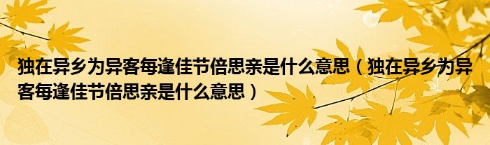 1、 1.獨(dú)在異鄉(xiāng)為異客每逢佳節(jié)倍思親是什么意思:一個(gè)人遠(yuǎn)離家鄉(xiāng)總是有點(diǎn)凄涼。每到重陽(yáng)節(jié),我都會(huì)想念遠(yuǎn)方的親人。