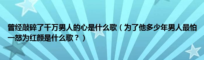 大家好,小安來為大家解答以上問題。曾經敲碎了千萬男人的心是什么歌,為了他多少年男人最怕一怒為紅顏是什么歌?很多人還不知道,現在讓我們一起來看看吧!