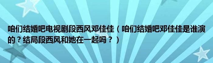 大家好,小安來為大家解答以上問題。咱們結(jié)婚吧電視劇段西風鄧佳佳,咱們結(jié)婚吧鄧佳佳是誰演的?結(jié)局段西風和她在一起嗎?很多人還不知道,現(xiàn)在讓我們一起來看看吧!