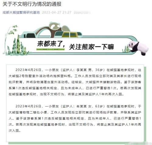 4月27日晚,成都大熊貓繁育研究基地發布通報稱,4月26日,一名小朋友在熊貓基地參觀時,往大熊貓2號別墅室外活動場內拋擲塑料瓶,并在熊貓博物館二樓處小便。這種不文明的行為不僅有損公共場所的衛生環境,也會對大熊貓的生活造成威脅,因此,工作人員對其及其家長進行現場批評教育,并嚴重警告一次,如果再次發現不文明行為,將禁止其及其監護人1年內再次入園。