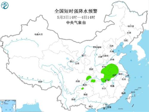 中央氣象臺在5月3日10時繼續發布強對流天氣藍色預警,預計在5月3日14時至4日14時期間,內蒙古中北部、河南東南部、安徽中北部、江蘇中北部、湖北東部等地的部分地區將有8-10級雷暴大風或冰雹天氣,而山東南部、河南東南部、安徽中北部、江蘇西部、湖北東部和西南部、四川東北部、重慶東北部等地的部分地區則將有短時強降水天氣,小時雨量20-40毫米,局地可達40毫米以上。