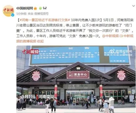 在5月1日,河南洛陽欒川老君山景區迎來了大量游客,導致景區達到了限流標準,停止了售票。這讓許多游客無法進入景區游玩,不禁感到失望。為此,景區工作人員向近千名游客提供了“我欠你一次旅行”的“欠條”。據工作人員介紹,游客可以在未來的十年內,憑此“欠條”免費進入景區游玩一次。