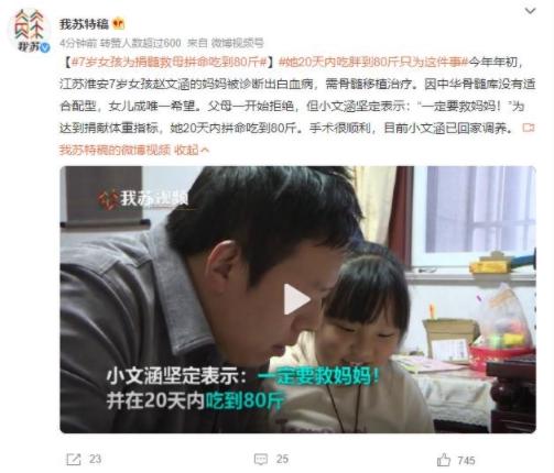 江蘇淮安7歲女孩趙文涵的媽媽今年年初被診斷出白血病,需要進行骨髓移植治療。由于中華骨髓庫中沒有適合的配型,女兒成為了唯一的希望。雖然父母一開始拒絕,但小文涵卻堅定表示:“我一定要救媽媽!”為了達到捐獻體重指標,她拼命吃到80斤的身軀。手術非常順利,小文涵已經回家調養。
