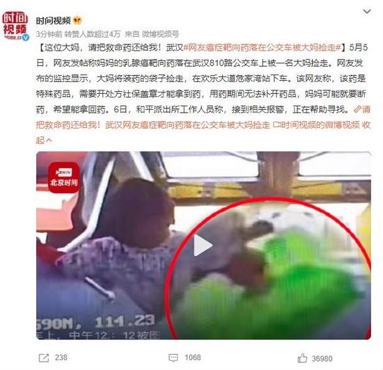 近日,一則關于武漢一位乳腺癌患者的消息引起了社會各界的關注。據網友爆料,該患者的靶向藥落在了810路公交車上,被一名大媽撿走。這種藥品是特殊藥品,需要開處方并獲得社保蓋章才能領取,用藥期間無法補開藥品,因此患者可能面臨斷藥的危險。