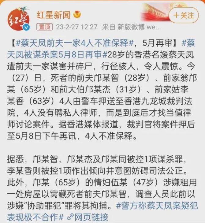 近日,香港時裝界名媛蔡天鳳涉嫌碎尸案的審理在九龍城裁判法院進行。據報道,法庭決定將案件審理延期至7月31日,以便對案發現場內的電鋸等超過30件廚房工具進行DNA檢驗。