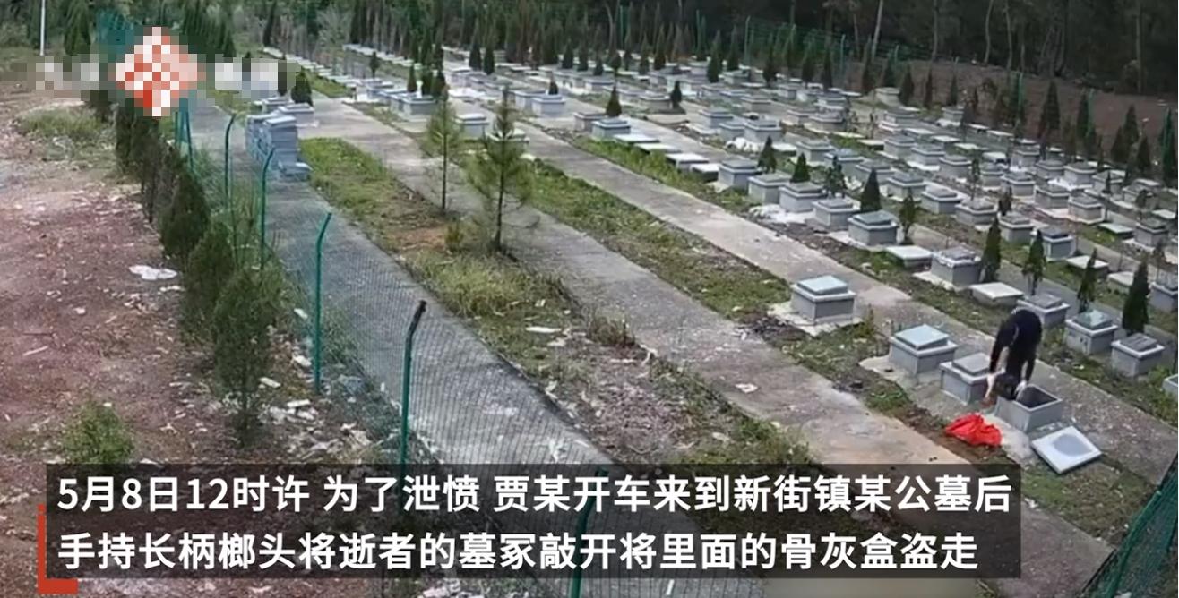 據(jù)了解,事發(fā)當(dāng)天中午約12時(shí),賈某駕車來到新街鎮(zhèn)的某公墓。他手持一把長柄榔頭,敲開了逝者的墓冢,并盜走了骨灰盒,以此來泄憤。事后,賈某將盜得的骨灰盒扔進(jìn)了附近的河道。